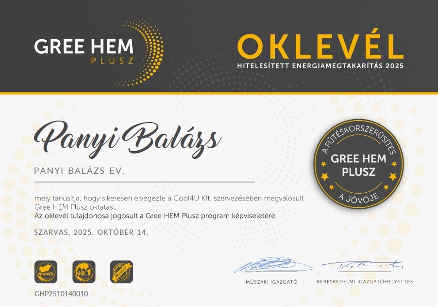 2025. szeptember 15-től elérhető a Gree HEM Plusz program, amely akár 30% támogatást és 10 év garanciát kínál azoknak, akik gazdaságos, környezetbarát fűtésmegoldást keresnek. Ideális választás kiegészítő fűtéshez: télen csökkenti a költségeket, nyáron pedig hűtést biztosít a Gree magasoldalfali klímákkal.